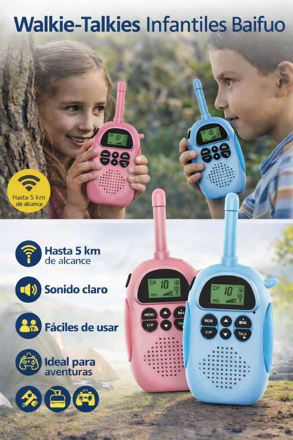 Los walkie-talkies infantiles Baifuo MY-7279 están diseñados para que los niños se comuniquen de forma fácil, segura y divertida. Ofrecen una señal potente y estable, ideal para juegos al aire libre, excursiones, camping o aventuras en casa. Su diseño ergonómico y ligero se adapta perfectamente a manos pequeñas, mientras que su manejo sencillo permite usarlos sin complicaciones.